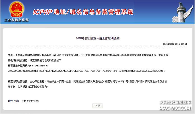 工信部關于2018年ICP備案信息抽樣核查通知