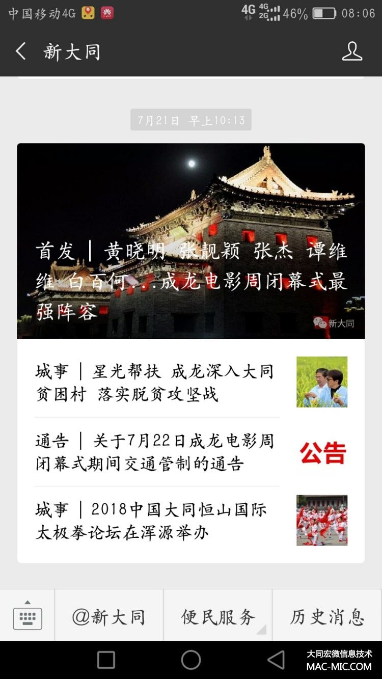 7月21日,由宏微信息技術旗下新大同微信平臺首發(fā),新大同網(wǎng)、今日頭條新大同號,搜狐新大同號等全媒體陣容推出的《首發(fā) | 黃曉明 張靚穎 張杰 譚維維 白百何...成龍電影周閉幕式最強陣容》一文在網(wǎng)絡一經(jīng)推出就開始熱傳。成龍電影周在大同舉辦,閉幕式廣受關注,新大同內(nèi)容發(fā)送及時,內(nèi)容獨特,編排新穎,受到眾多關心大同旅游發(fā)展、關系成龍動作電影節(jié)的網(wǎng)友一致好評。