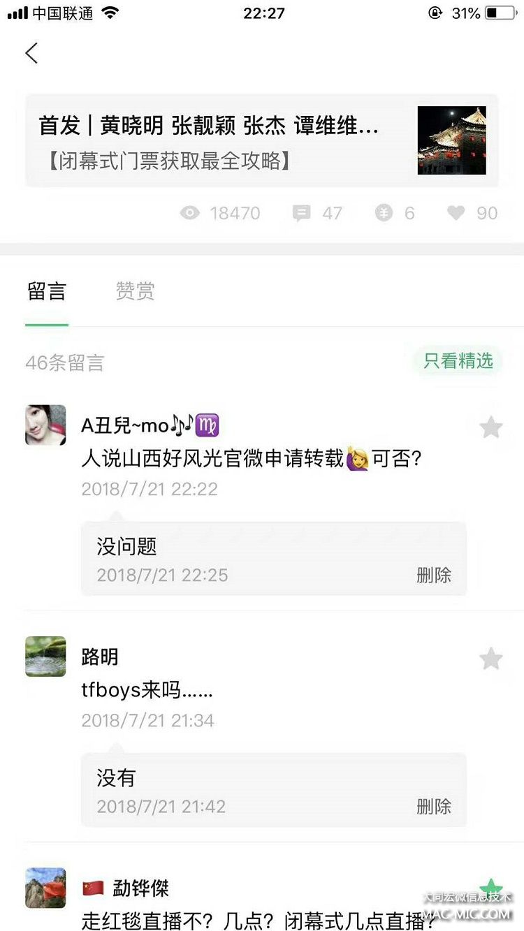 在獲得小編同意并授權后,當晚11:30分左右,由新大同原創(chuàng)《首發(fā) | 黃曉明 張靚穎 張杰 譚維維 白百何...成龍電影周閉幕式最強陣容》在人說山西好風光官微發(fā)送,將成龍電影周閉幕式消息分享給全國、全世界的粉絲。