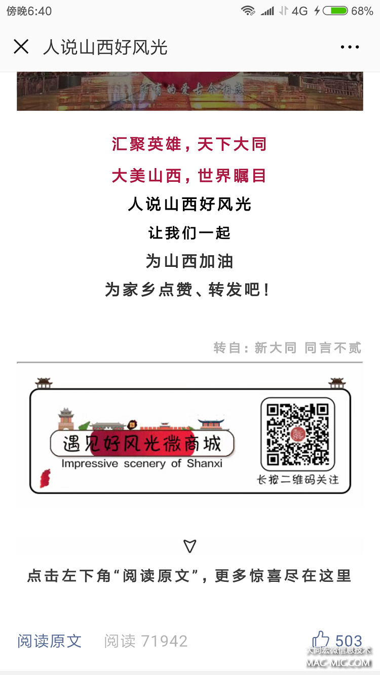 截止發(fā)稿時,新大同原創(chuàng)微文《首發(fā) | 黃曉明 張靚穎 張杰 譚維維 白百何...成龍電影周閉幕式最強陣容》在人說山西好風光的閱讀量已經(jīng)達到7W+,新大同平臺通過不斷完善創(chuàng)新發(fā)展,為我們大同旅游、為山西旅游發(fā)展不斷貢獻自己的小小力量。