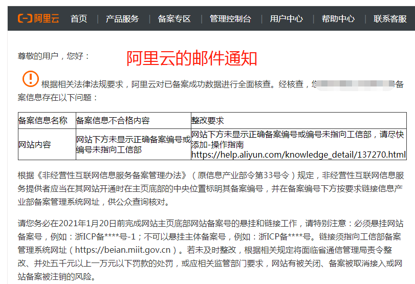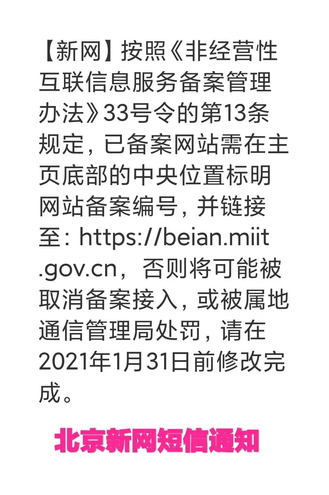 近期,很多用戶收到有關(guān)網(wǎng)站備案核查短信或郵件,提示用戶在網(wǎng)站下方未顯示正確備案編號或編號鏈接未指向工信部: