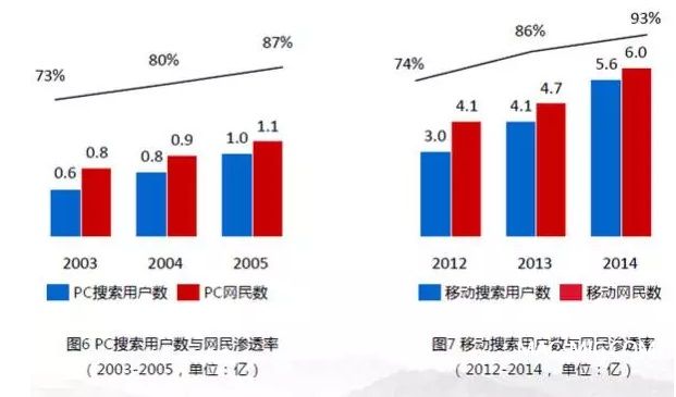 移動搜索的發(fā)展歷程與早期的PC很相似,不過移動搜索的發(fā)展更為快速。據(jù)百度2015年初發(fā)布的《移動互聯(lián)網(wǎng)發(fā)展趨勢報告》顯示,移動搜索已成為用戶規(guī)模僅次于社交通信的第二大應用垂類,且移動用戶的搜索需求(人均搜索次數(shù))呈現(xiàn)穩(wěn)步提升趨勢。此外,百度移動搜索流量也已超過了PC搜索。