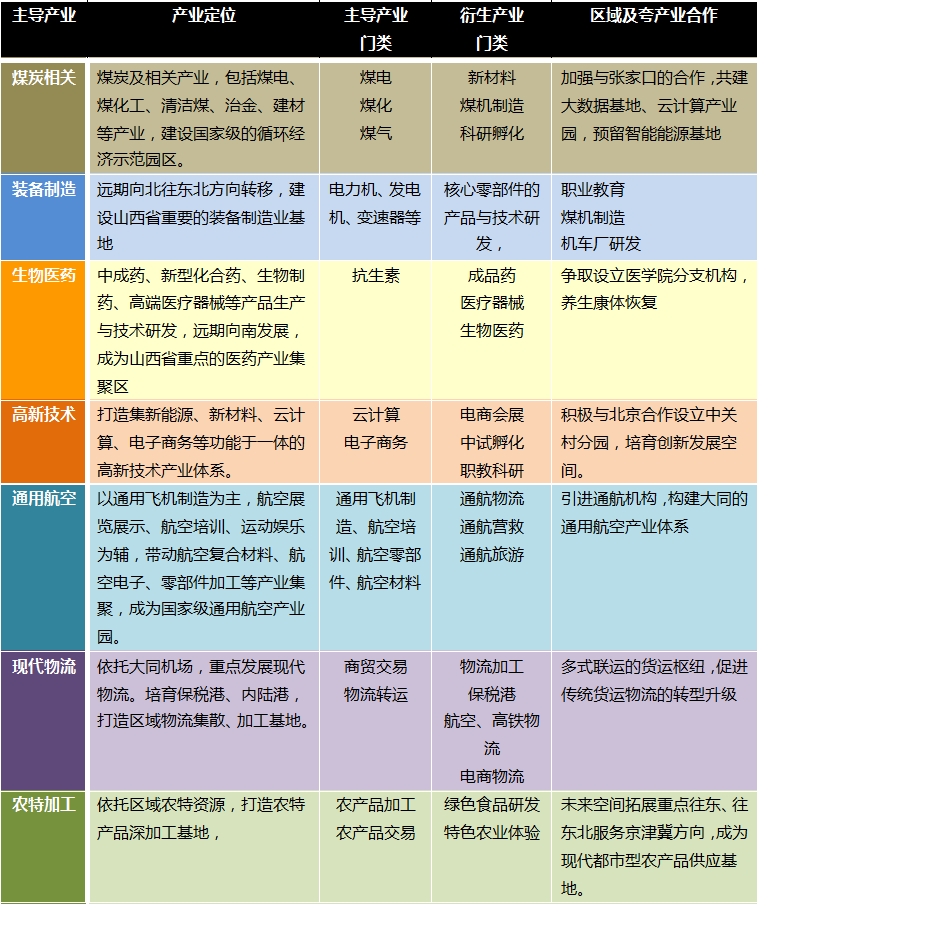 西部版塊為塔山循環(huán)示范區(qū),以煤炭工業(yè)為核心,縱向延伸煤炭相關(guān)產(chǎn)業(yè)鏈,促進煤電一體化、精細煤化工發(fā)展;東部版塊包括經(jīng)濟技術(shù)開發(fā)區(qū)、裝備園區(qū)、空港物流園區(qū),致力于傳統(tǒng)優(yōu)勢產(chǎn)業(yè)的提升;東南版塊為新興產(chǎn)業(yè)預留版塊,主要發(fā)展通用航空、新材料和醫(yī)療健康產(chǎn)業(yè);大同縣版塊主要發(fā)展農(nóng)特小微產(chǎn)業(yè);位于西北部的新榮板塊以農(nóng)牧產(chǎn)品加工、物流、石墨新材料為主。
